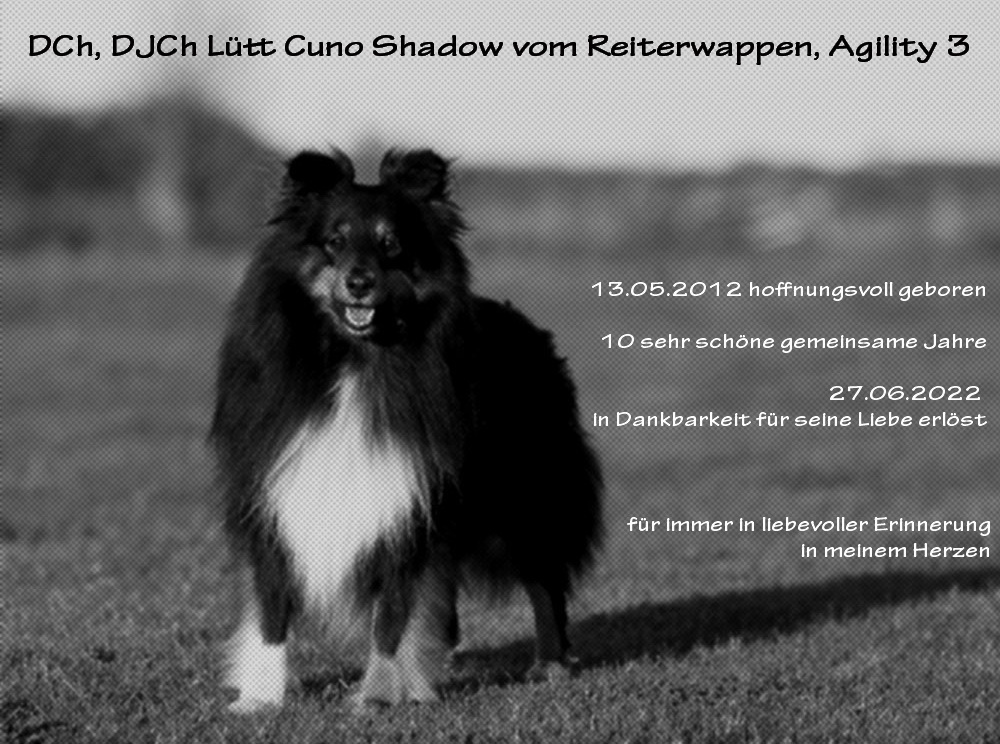 | Cuno Deutscher Champion (VDH) Deutscher Champion (CfBrH) Deutscher Jugendchampion (CfBrH) Lütt Cuno Shadow vom Reiterwappen geworfen: 13.05.2012 HD-A1 CEA/PRA/Kat./Dist./MPP-frei (7 Wochen) CEA genetisch frei, MDR1 (+/+) vollzahnig, Naturkippohren 39 cm, Körklasse I DNA-Profil vorhanden Begleithundprüfung, Agility 3 Gewinner des Zierower Wintercup |