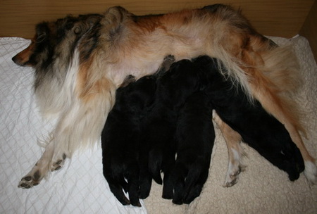 meine Collie-Hündin Crazy säugte bereitwillig die 3 1/2 Wochen alten "Kuckuckseier"